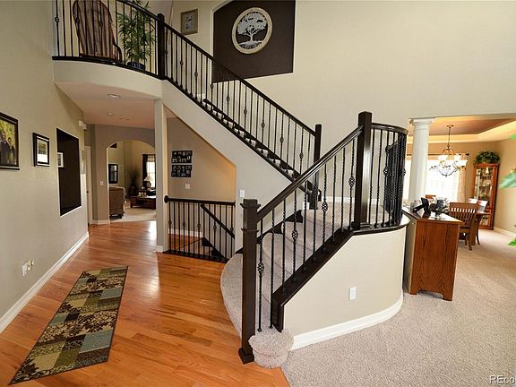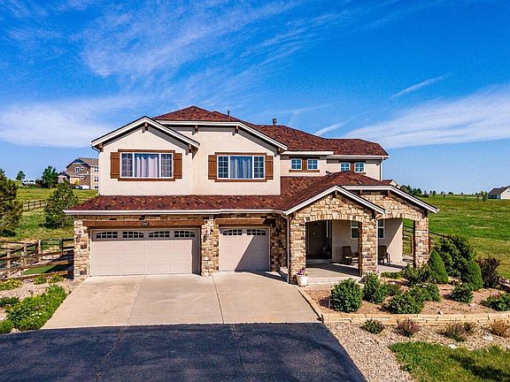 Colorado living at its finest! Stunning Elkhorn Ranch home on 5 Acres with open vistas and a superb "Cleary" garage/storage outbuilding. This home with its open floor plan and newly painted interior shows beautifully. The large kitchen has a breakfast nook with bay window, stainless steel appliances, granite countertop, walk-in pantry, large island and opens to the family room and the covered back patio. The large family room has high vaulted ceilings, surround sound and gas fireplace. A beautiful living room with high vaulted ceilings and gorgeous natural light opens to the entry and dining room. The dining room has a gorgeous coffered ceiling and is perfect for entertaining and family holiday meals. All bedrooms are large with great natural light and views. The master bedroom has a fireplace, a large peaceful sitting area with a bay window and a beautiful master bath with walk-in closet. The open loft overlooks the family room and shares a Jack-and-Jill bath with the second bedroom. The third bedroom has a private en-suite three quarter bath Other features include two hot water heaters, two furnaces, two Central AC units, hardwood floors, wrought iron staircase, home warranty, monitored security system and surround sound. The fantastic Cleary outbuilding is 56X42, has two 12x14 bay doors, a side door and is in superb condition. In the countryside with city convenience. This home is only minutes from Southlands, downtown Parker, the Aurora Reservoir and much more. This is it.