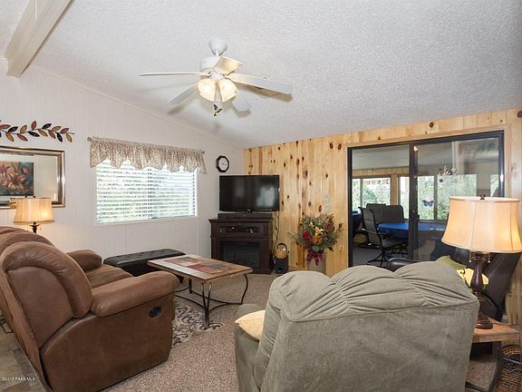 Adult community close to shopping, Prescott and Prescott Valley. Located on a corner and surrounded by mature tree. A seasonal spring fed creek and pretty views all in a move in ready home. The house is immaculate and furniture (Excluding the dining room hutch) is available for complete turn key transaction. The two bedrooms are generous, the open concept living, dining ad kitchen are perfect for entertaining. The huge heated Arizona Room provides additional living space to enjoy the natural beauty of the area, the wildlife and the sunsets.New Rook in 2014New Heat/AC 2016Water Softner
