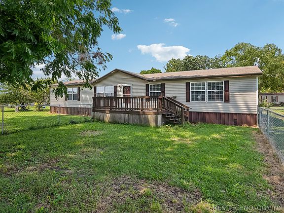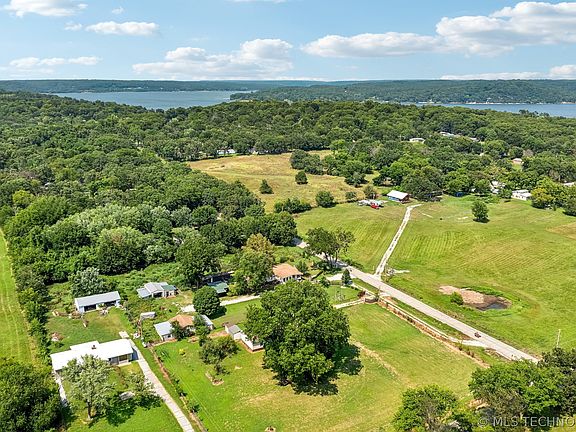 Looking for an affordable home near Grand Lake? Check out this 3 bed 2 bath home set on 1 acre m/l. Open, split floor plan. Spacious living has fireplace with stone surround. Kitchen with snack bar and nice walk-in pantry. Formal dining. WIC in all bedrooms! Primary suite has private bath with corner garden tub, separate shower, and double sinks. Nice-sized laundry room. Updated lighting. Only 1.4 miles to Hickory Creek public boat ramp! Less than 15 min to Bernice State Park/public beach. Paved roads lead to home's convenient location, less than 10 miles to shopping & hospital. Large covered deck with ramp. Storage shed. Newer chain link fenced play area, and farm fenced yard with gate. Peach, Pear, and 2 apple trees!