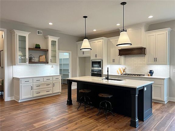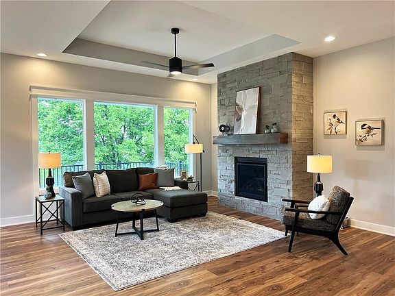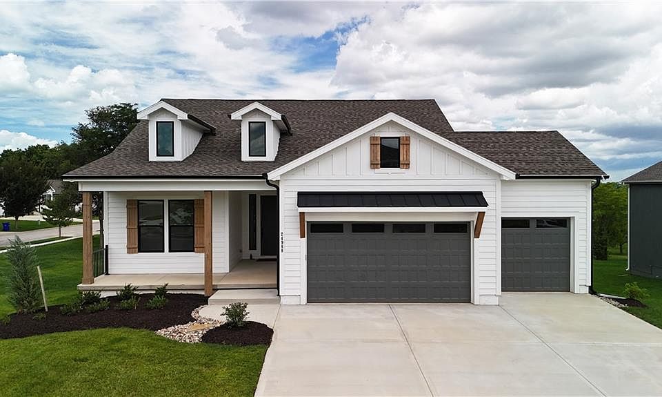 Reduced and ready for a quick move-in! Nestled on a spacious corner lot with walkout basement, this award-winning Reverse 1.5 Story offers a modern and functional design. The main level features the primary suite, an additional bedroom, and a spacious kitchen with quartz countertops and stainless steel appliances. Downstairs, you'll find two bedrooms (one with a huge walk-in closet) and a recreational room with a wet bar. Enjoy outdoor living on the covered deck or patio, overlooking mature trees. The home boasts a stylish farmhouse exterior, a 3-car garage, and high-quality finishes throughout. Schedule a tour to experience this exceptional home firsthand. The Huntford community offers oversized 85'+ wide lots surrounded by mature trees and adjacent to Prairie Highlands golf course. Low HOA fees and less than 10 minutes from K7/I-35 highway and a short drive to Lake Olathe, Prairie Center Nature Preserves, KC Winery, and the NEW Cedar Niles Trail system!