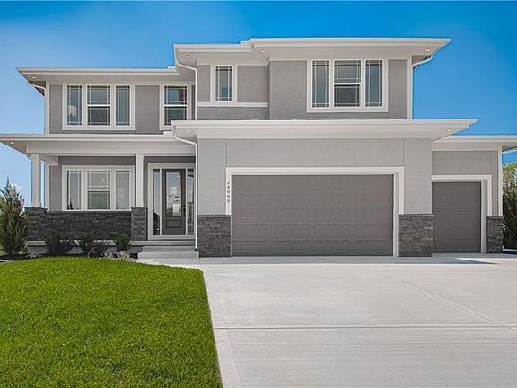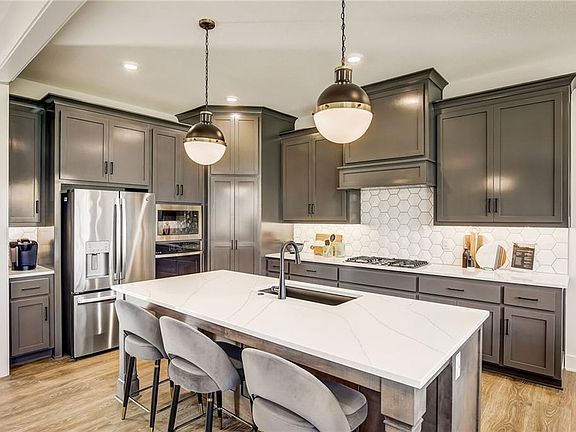 MODEL HOME NOW FOR SALE AND JUST REDUCED! The popular and award-winning Calistoga 2-Story by Inspired Homes has 6 bedroom/5 bath + LOFT + finished basement! Situated on a large corner lot in the newest & final phase of Huntford in scenic Western Olathe. Nearly 4,000 square feet of living space, which includes a main level guest suite/office, full bath, 4 bedrooms up with loft, and a finished LL with rec room, wet bar, bedroom and bath. Gather together in the open concept kitchen/great room with impressive stone fireplace and custom built in cabs with floating shelves. The kitchen offers deep tones of grey & sparkling white Quartz countertops. Watch those games in the finished basement with plenty of room for movie night, game night and play. Designer touches throughout including upgraded tile, flooring, lights and appliances. Huntford is the escape to country living yet less than 10 minutes to K-7/I35, shopping, restaurants and recreation.