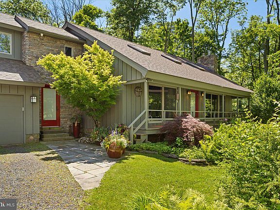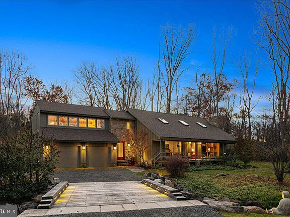 Sited on 6.9 Private Wooded Acres, this mid-century converted barn home designed in a peaceful setting is magnificent! Rolling hills, tranquil woods, and a meandering creek, just what a nature lover dreams of. This home features 3,000 sqft of living space, a porch surrounding the front of the house, and a plethora of glass that bathes the home in light. As you enter the home into the two-story-tall living room, you'll immediately notice the curated details from exposed beams and timber ceilings to the clerestory windows that look out onto the garden and Aquetong creek. This home comes with four bedrooms, two full bathrooms, and two half bathrooms. The primary bedroom comes complete with a walk-in closet, and the primary bath has a large porch overlooking the garden. The two-story family room & dining room has a stone fireplace along with beautiful wood floors. There is a loft study above that looks into the family room. There is also an added office/studio attached to the home designed by award-winning Architect Ralph Fey. His use of large windows and wood beams gives you the illusion of stepping directly into nature. The current residents added to the natural landscape to create a peaceful home for daily living, working, and respite. There is also a concrete and steel bridge with new wood decking. This home is tucked away in Solebury, PA, down a quiet lane and 2 miles to the most remarkable town in Bucks County, New Hope.  A nature lover's dream home. Award-winning prestigious New Hope Solebury school district 10/10 rating. Call today for a private showing.