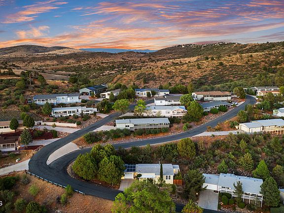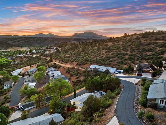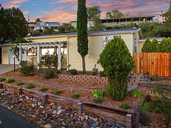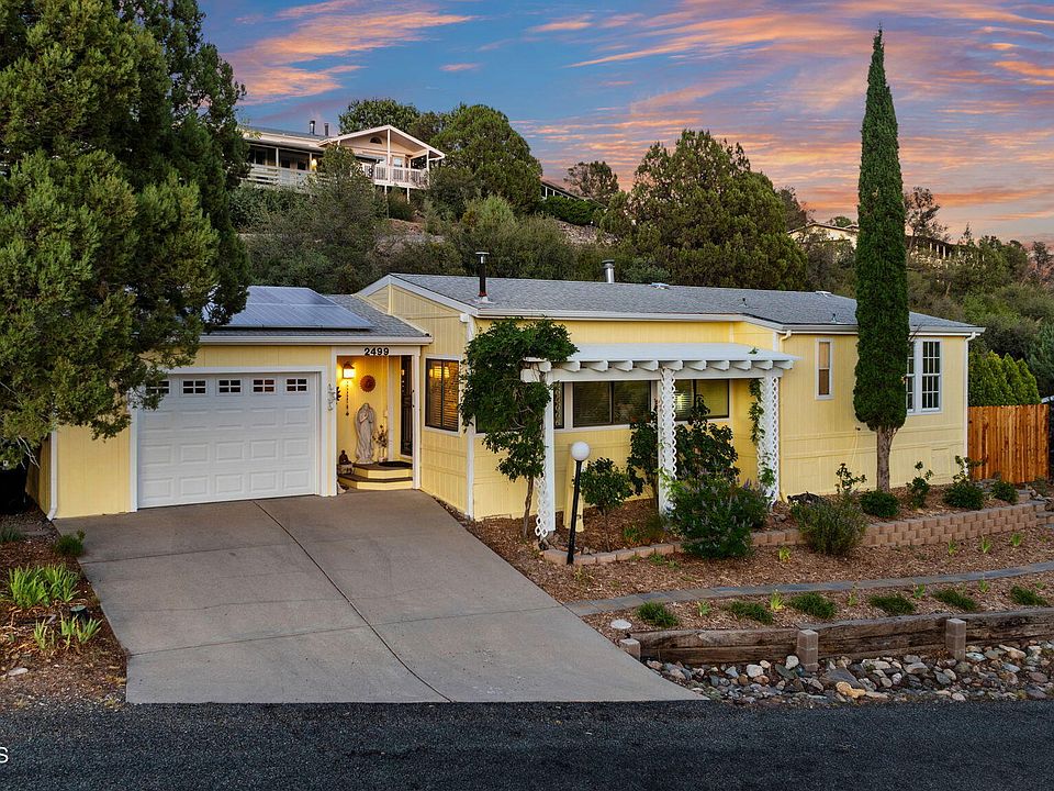 Bask in breathtaking panoramic views of Prescott from this lovingly maintained and beautifully updated 2BD/2BA home in 55+ Prescott Canyon Estates community. Featuring rich oak plank flooring and a spa-inspired bath with a garden tub and Corian countertop, this residence blends timeless elegance with modern comfort. The bright 210 sq ft addition floods the home with natural light and sweeping views, ideal for relaxing or entertaining. Double-pane E-coated windows and new storm gutters (2023) boost energy efficiency. Enjoy a lush, meticulously landscaped yard with vibrant foliage and a full drip irrigation system. The spacious second bedroom opens to a serene private sitting patio. A 390 sq ft garage with bonus storage and permitted leased solar panels complete this elegant, turn-key oasis