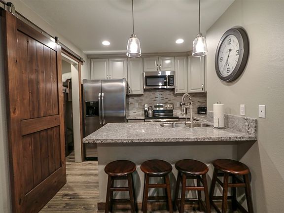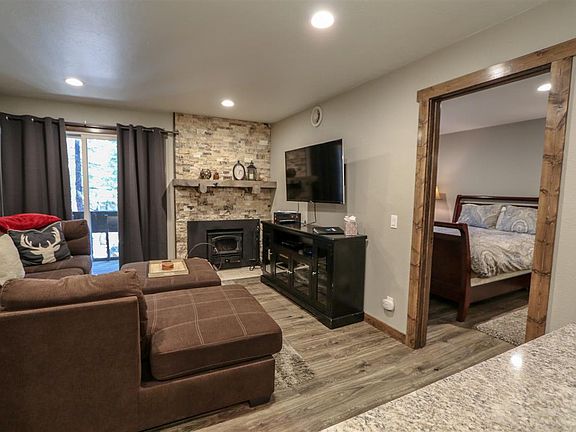 Gorgeous and SMART condo! Ultra clean and modern, completely remodeled top to bottom and features high-end appliances, finishings and flooring throughout. The living room has a large 50" 4K TV, rustic wood-burning fireplace and comfy sectional that can seat the entire family. The custom kitchen has been upgraded with new cabinets, stainless steel appliances, granite countertops and tasteful pendant lighting, as well as a fully stocked kitchen with ALL of the essentials to prepare your meals. The master bedroom offers a queen bed, a second TV, and connected bathroom which has been upgraded with granite countertops, new cabinets, modern flooring and toasty radiant heating. The bunk alcove next to the kitchen features two full size twin beds, each with their own power outlets, storage cubbies and hangars and is perfect for kids or extra guests in your party. The outdoor balcony overlooks the complex picnic area that features a new pool, jacuzzi, horseshoe pit, cornhole, picnic tables, a gas grill and tennis courts. Super low monthly HOA ($295). All exterior walls have new R-22 rated insulation. New dual pane windows. Room heaters are wifi controlled with programmable thermostats. Keyless door lock also wifi controlled. LED canned lighting on dimmers and wifi controllable. W/D hookups. Corner unit with a private deck and view to the woods. Exterior storage closet. On the town/ski area bus route. Everything permitted. Fireplace is up to code!!! This is a must see!
