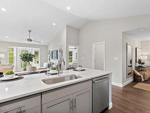 DISPLAY FOR SALE! Summerfield Ranch 2 bed 1 bath home former display home is ready now! This cozy cottage is perfect for entertaining! Vaulted ceilings and wood laminate flooring in main living areas. The kitchen features gray 42” tall cabinets, quartz countertops, white subway tile backsplash, large peninsula with extended countertop for breakfast bar, and stainless steel GE appliances with refrigerator included. Bay window with door in living room opens to composite deck. The master suite features two closets and access to bathroom with walk in shower and double bowl vanity. White six panel interior doors, upgraded lighting with ceiling fans, main floor laundry, and one car garage. The lower level includes a ¾ bath rough-in for future finish. Windswept Farms is a great community located in Jefferson County in the Rockwood School District offering beautiful homesites and onsite amenities!
