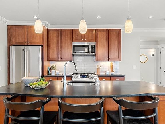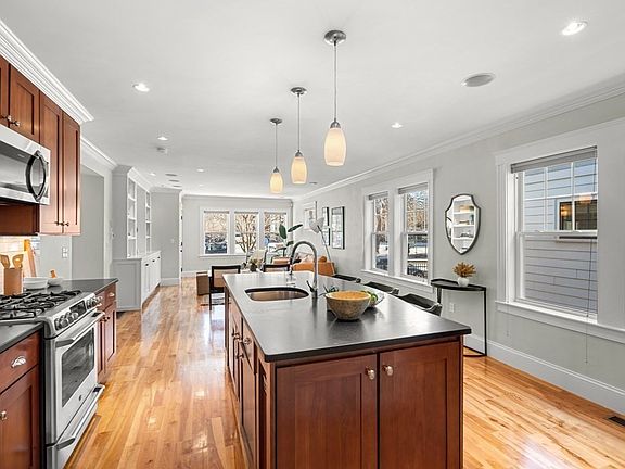 Spacious and beautiful three-bed, two-full bath unit in vibrant Jamaica Plain. This bright and sunny home features high ceilings and tons of windows. The large open floor plan is great for entertaining with a fully equipped kitchen and large island. A wet bar with wine fridge brings you to a separate dining room, which can also be a tucked-away playroom or another bedroom. The primary bedroom with en-suite bath is tranquil, bright and airy. When coming in from your private backyard or one of your 2 garage parking spaces, you enter a great mudroom with coat hooks and bench. Additional features include in-unit laundry, generous closet space and tons of basement storage. Located in a well-maintained, pet-friendly building, this home is just steps away from the many shops, restaurants and cafes Center Street offers. Seller to review offers Monday January 22nd at 3:00.