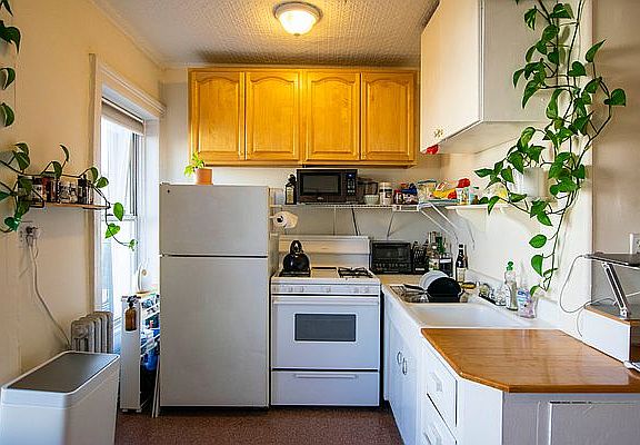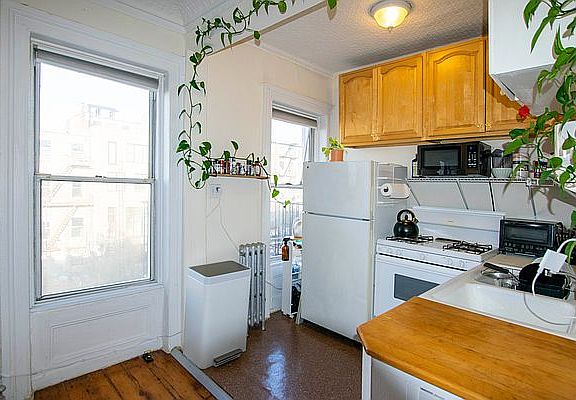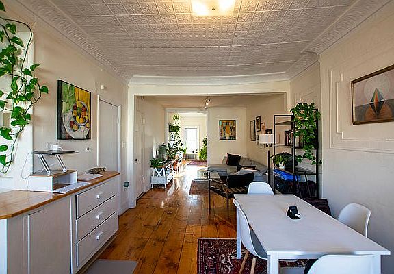 Rarely Available LOFT Brownstone apartment Splashing with Sunshine all day long! Love living nestled in a row of Brownstones on a quiet tree lined block! Loaded with ornate detail, polished wide plank pumpkin wood floors, tin ceilings and over looking the Front Gardens of Carroll Gardens (no outdoor space), tree top, skyline & freedom tower views. Spacious kitchen to cook up your favorite meal with separate dining area, over sized living room and KING size bedroom plus. Blocks to all the neighborhood has to offer, 2 blocks to F/G trains at Carroll Street Station, laundromat & citi bike at the corner Cat ok, NO dogs please, brokers fee