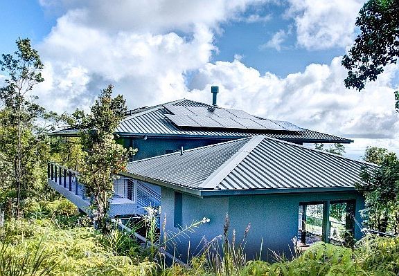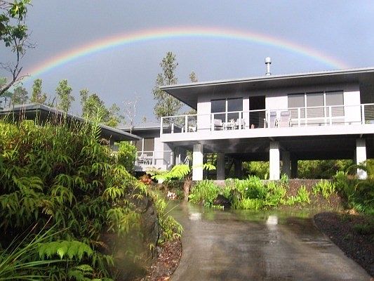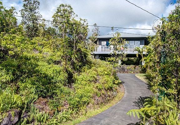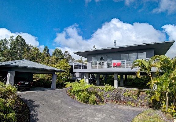 Impeccably Designed Home Harmonizes with Nature! The geometric symmetry of this impeccably designed home harmonizes with the natural surroundings. Located in upcountry Kaumana on a consolidated double lot, the sturdy and stable construction will stand the test of time. Placed among native Ohia trees, undulating pahoehoe lava and lovely wild Orchids, you are surrounded by endemic Hawaiian flora. The contemporary style and clean mathematical lines allow the occupant to live the simple lifestyle away from the crush of material excess. The home has two distinct living spaces. On the upper most level is the main living area consisting of a full kitchen, dining room, living room, office nook, master suite with full bathroom and closet as well as a half bath for guests. Floor to ceiling windows flood the rooms in morning light and reveal the sparkling bay and forest view. A Morso wood stove keeps you cozy on rainy nights. The kitchen features European cabinets, lava rock floors, lava rock slab countertops and stainless appliances. The bathrooms feature European vanities and mirrored cabinets, lava rock floors and Kohler sinks set in lava rock vanity tops. The master bedroom features a French door to the wrap around lanai and a walk-through wardrobe to the master bath with a Kohler Simbio soaking tub. The Bungalow sits a few steps lower and consists of a studio bedroom, walk-in closet and full bathroom. This separate space is perfect for guests to Hawaii, your college kid or as an AirBnB nightly rental. Both spaces of the home are surrounded by the wide, covered lanai to enjoy the outdoors from any angle. Sit on the back side of the home facing the Hilo Forest Reserve in the afternoons to soak up the mountain sun or enjoy the vast ocean views from the front lanai looking out to Hilo Bay and beyond. The property is powered by the sun with an owned solar PV system AND net-metered with Helco for rainy days. Rain water catchment storage is hidden in the foundation of the carport. Adjacent lot may be available. For info and pics sent instantly to your mobile device: Text "2559" to 79564.