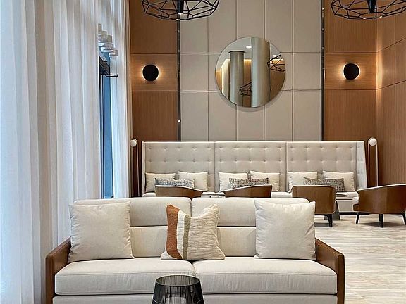 Soaring ceilingsOpen-concept layoutFloor-to-ceiling windowsModern kitchenBuilt-in appliancesQuartz countertopsSleek cabinetry