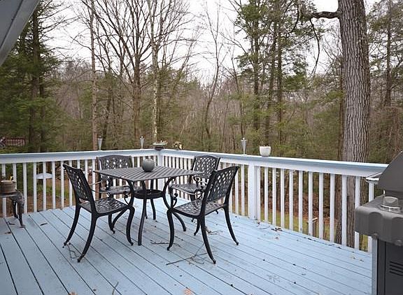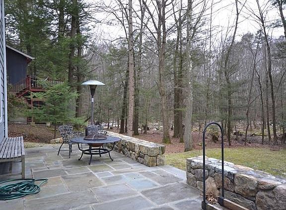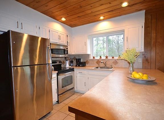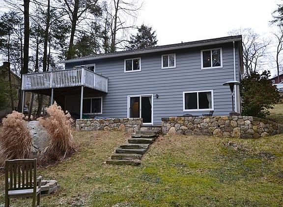 Updated lake community home with rustic feel and open floor plan, gorgeous kitchen with large island open to the dining room with access to large deck overlooking the level yard and field stone and slate patio ideal for your fire pit. The yard borders a peaceful brook. The large living room has loads of windows and sparkling hardwood floors. The home offers 3 spacious bedrooms and an updated main level bath. The lower level a large family room, a full bath. This family room walkout to the rear yard patio. Updated furnace, windows, roof, appliances, ust move in and enjoy. Blue stone walkway and field stone walls. Walk to the beach. This house is ready to move in an enjoy!