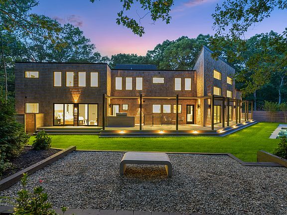 Experience the Hamptons at its finest in this stunning modern retreat, set on 1.7 private acres just moments from bay beaches. Designed for effortless summer living, this 5-bedroom, 5-bath home offers seamless indoor-outdoor flow, luxe amenities, and all the space you need to unwind and entertain. Soaring 24' ceilings and walls of glass flood the home with natural light, while the open layout connects a sleek chef's kitchen (dual fridges, dishwashers & pro-grade appliances) to multiple lounging and dining areas. Host with ease, from the spacious great room to the formal dining area-or take the party outside to the expansive mahogany deck with an outdoor kitchen, built-in grill, ice maker, and multiple seating areas. The heated gunite saltwater pool with spa & sun shelf is the heart of the property, surrounded by lush landscaping for total privacy. Rinse off in the outdoor shower, then retreat to one of two primary suites (each with spa-like baths) or unwind in the media room. A fully finished lower level offers bonus space for a gym, home office, or movie nights. With high-end finishes, smart home tech, EV charging, and top-of-the-line energy-efficient systems, this home is as stylish as it is functional. Located minutes from Three Mile Harbor, Cedar Point Park, East Hampton & Sag Harbor, it's the perfect summer escape for those seeking sun, sand, and sophisticated relaxation. Available for August - and won't last!