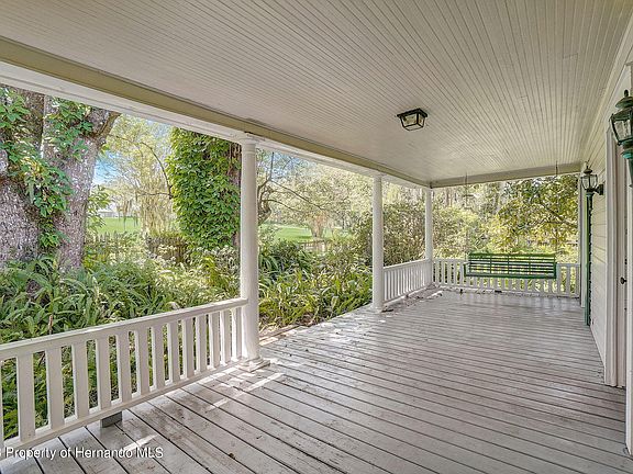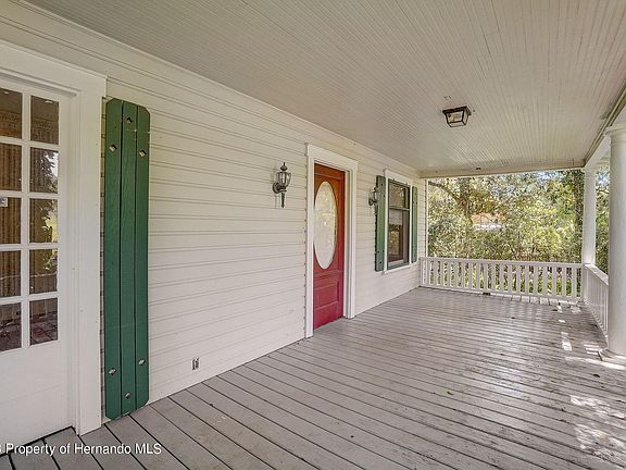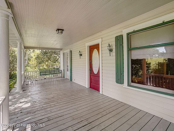 Welcome to 25 Alta Vista Street located in HISTORIC DOWNTOWN BROOKSVILLE. This charming property was BUILT IN 1920 and is nestled close to the center of town within walking distance to Main Street and all of the shops and restaurants along the way. Situated on a half acre fenced lot and filled with curb appeal including the GRANDFATHER OAKS out front, the 360 square foot FRONT PORCH, and METAL ROOF. The 2 CAR DETACHED garage out back was added in 2000 and offers unlimited possibilities. When you enter into the front door, you will be instantly charmed by the DOUBLE SIDED WOOD-BURNING FIREPLACE, ORIGINAL HARDWOOD FLOORING, tall ceilings and wood moldings. To the right of the family room, you will find the guest bedroom complete with fireplace and french doors that open to the front porch. Behind the family room, between the kitchen and family room, you will find the spacious dining room with custom built-ins. The kitchen is an absolute joy with a red and white checkered floor, cherry wallpaper and plenty of room to add a small dinette table. The inside laundry room is just off of the kitchen for ultimate convenience. The primary bedroom and full bathroom are tucked away towards the back of the home. Out back, you will find ANOTHER LARGE DECK WITH SPA and GAZEBO style seating area PLUS THE TWO CAR GARAGE AND LARGE CARPORT. The garage has an upstairs space WITH AN UNFINISHED APARTMENT. A little TLC is all that is needed to bring this beauty back to life. In addition to the home's remarkable features, the local area offers a VIBRANT AND HISTORIC COMMUNITY. Brooksville is rich in heritage, with its charming downtown area and picturesque streets. Enjoy leisurely walks to nearby shops, dine at unique restaurants, and immerse yourself in the captivating ambiance that only a historic town can provide. Don't miss out on this extraordinary opportunity to OWN A PIECE OF HISTORY in the heart of Brooksville.
