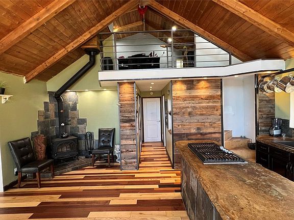 Access the property through a security gate at the gravel driveway. Descend the wooden decks stairs, passing the koi pond and Japanese gardens. The front door opens to a vaulted kitchen, dining room with view of the upper loft. A hidden staircase ascends to a lodge style loft bedroom, with two built in twin beds surrounded by bookshelves, ample floor space, abundant storage and a secret reading nook. Walk past the barnwood accents and the wood burning stove. Off the dining room step down into the living area with a bay window and an adjacent solarium. Nestled behind the living area, you will find the primary bedroom with a four-piece private bath, office and storage closet. Centrally located is the third bedroom, main bath and spacious laundry room. An elevated bathtub and built in kennels were used as a grooming studio. From the deck you will see a flat meadow, on the perimeter you will find three custom buildings: a custom shed, hen house and a dog kennel. The view at night offers the sparkle of city lights. Rabbit hutches, Shop/Barn, Shed included