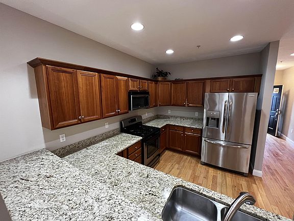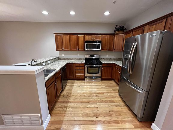 Spectacular end unit with two car garage, this unit is updated and move in ready for easy condo living. Beautiful hardwood floors throughout the entire unit. The first floor features a spacious kitchen with ample counter space for the at home chef to work and the entertaining areas will host large gatherings comfortably and with ease. The family room with dramatic cathedral ceilings, tons of natural light and access to private deck with maintenance free decking and just two steps down to lawn area. On the second floor you'll find two bedrooms both with Custom California closets as well as small nock perfect for a work from home setup. The lower level is clean and dry and can be used for additional storage space.
