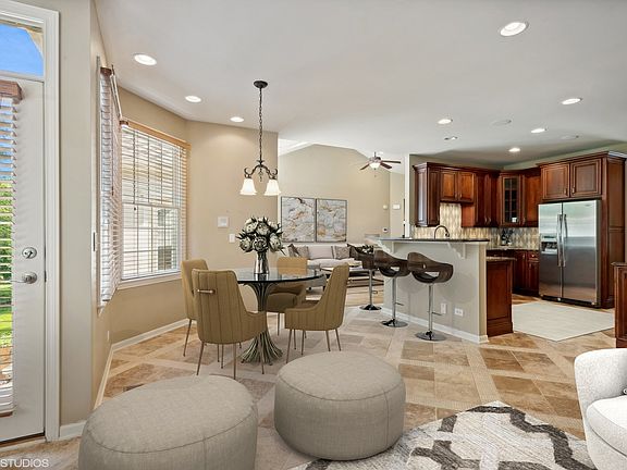 A fabulous offering in a premier gated community - The Regency at the Woods of South Barrington - a 55+ active adult community offering resort style living! Enjoy a vibrant lifestyle with amenities including pool, sports courts, fitness room, clubhouse and many social activities in a private gated setting! This elegant and meticulously maintained ranch home offers true one-level living, designed to provide comfort and luxury at every turn. Step inside to a spacious, open floor plan flooded with natural light, highlighting the custom moldings and architectural details that add a touch of sophistication throughout. The foyer, living, and dining rooms boast stunning hand-scraped hickory flooring. The dining room, situated just off the foyer, features a columned entry and custom built-in shelving perfect for your dining service. The living room is a true showstopper with its vaulted ceiling and two skylights, creating an airy and inviting space. Moving seamlessly into the heart of the home, the kitchen, breakfast room, and family room blend together beautifully, all adorned with custom stone flooring. The kitchen is a chef's delight, with gorgeous cherry cabinetry, stainless steel appliances, pantry closet and breakfast bar. The adjacent breakfast area and family room, complete with a cozy gas fireplace and a door leading to the paver patio, make for perfect spots to gather and relax. Your private retreat awaits in the large primary bedroom, featuring a sitting area with a door to the paver patio, a walk-in closet with custom organizers, and a luxurious ensuite bath. Two additional bedrooms share a well-appointed private bath, ensuring comfort and convenience for family or guests. A charming powder room and a laundry room with access to the two-car garage complete the main floor. The full unfinished lower level offers endless possibilities for future expansion. Outside, enjoy the private patio, perfect for morning coffee or evening gatherings, surrounded by a lush, grassy lawn area and beautiful landscaping. A dynamic lifestyle awaits you in this private gated setting ideally located near shopping & dining at the Arboretum of South Barrington and providing easy access to O'Hare and transportation corridors. Experience the perfect blend of elegance, comfort, and convenience!