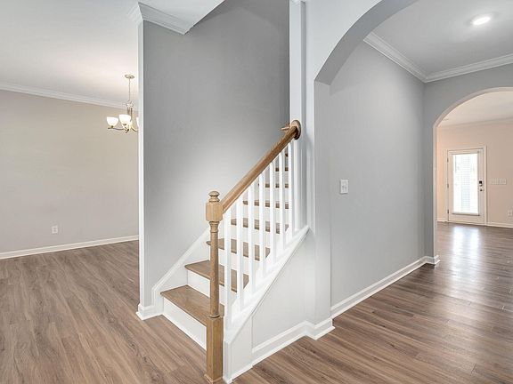 Nestled on a corner lot, this stunning home features a sprawling porch and a warm foyer that flows into a spacious great room. The open-concept kitchen is equipped with a large island, butler's pantry, and formal dining room, perfect for entertaining. The first floor is complete with luxury vinyl flooring and a guest/in-law suite. Oak-stained stairs lead to the second floor, where three additional bedrooms and a lavish primary suite with en-suite bathroom and walk-in closet reside. A bonus room offers flexibility. The covered rear porch provides a serene setting for sunset views, overlooking a level yard. Situated in Clayton's desirable Cleveland area, this property offers exceptional schools, easy highway access, nearby dining, shopping, healthcare, and entertainment options.