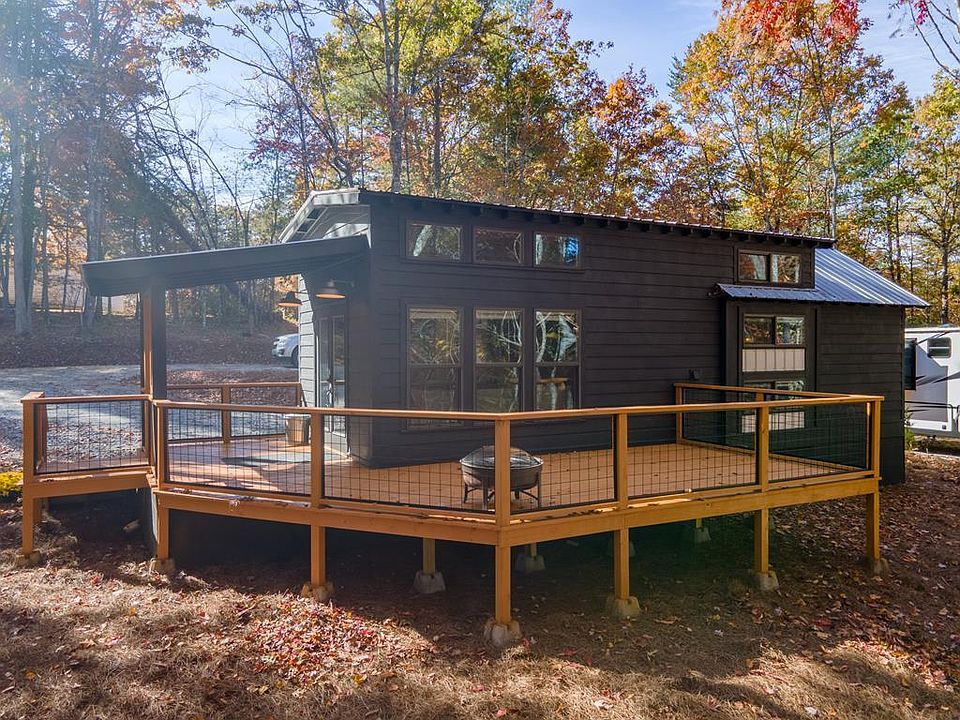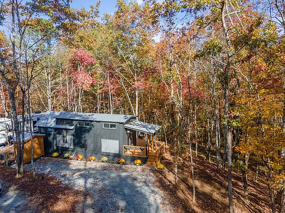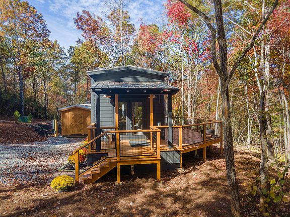 Discover this charming, furnished tiny home nestled among the trees. Ideal for a cozy retreat with 1 BR, 1 bath, & space to comfortably sleep 6. The unit features double bunk beds, a queen-size bedroom, & a loft above. The home showcases brand-new exterior paint & a wraparound deck, perfect for outdoor living. The spacious deck is fit for a fire pit & grilling. Additionally, a new shed offers extra space. Inside, pine hardwood floors & vaulted ceilings create an open atmosphere. An electric fireplace adds warmth to the living room. The full-size kitchen provides ample room for cooking & baking. The bedroom offers generous closet space, & a laundry area conveniently located in the hallway. A ladder leads to a full-size loft, perfect for sleeping or storage. This home is an excellent choice if you're drawn to minimalist living with room to breathe. The .78-acre lot offers privacy & space for pets. Paved streets wind through Bear Claw Ridge, a community with lovely tiny homes, fostering a sense of community. Located near Franklin & essential amenities, Bear Claw Ridge offers the best of both worlds. Experience the simplicity of tiny living in a tranquil, community-oriented setting!