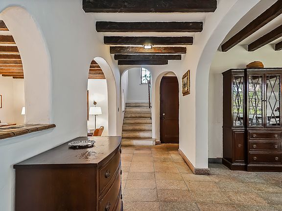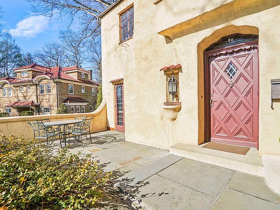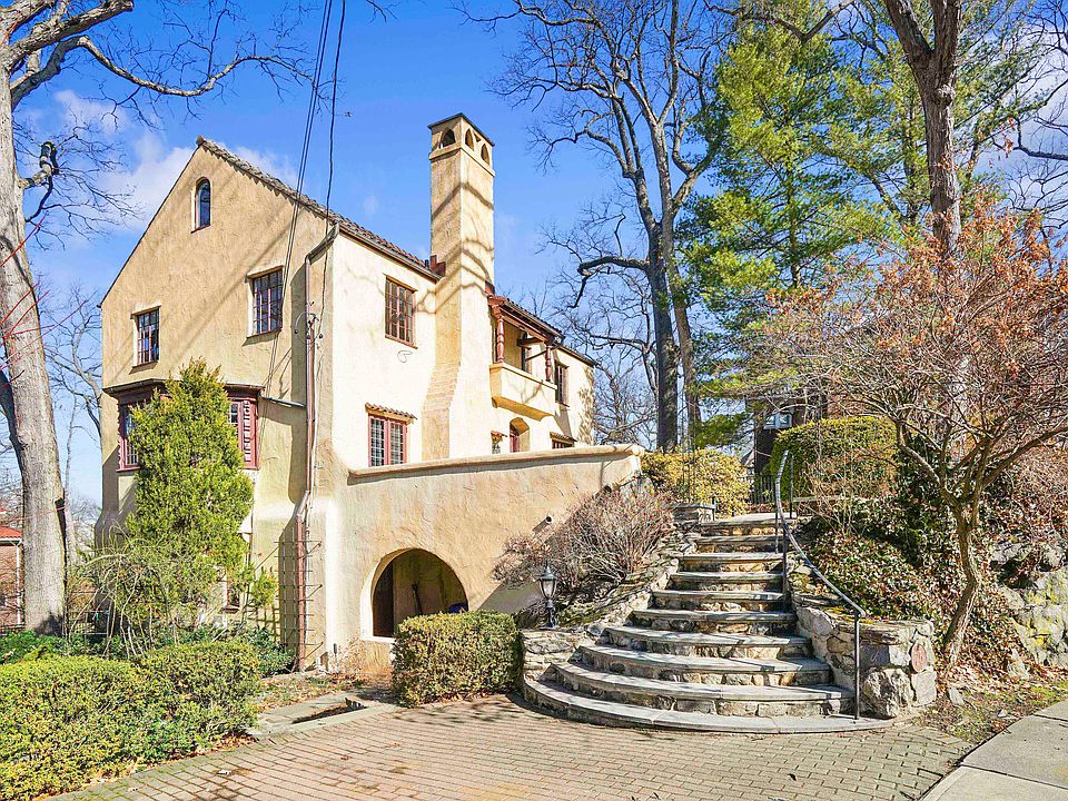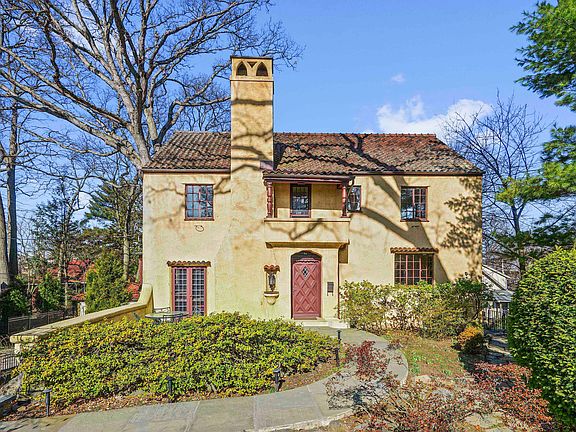 Nestled on a craggy perch with distant views over Pelham, this 1924 architectural masterpiece has been lovingly preserved to retain the style and details envisioned by its famed architect, Guy Mariner. As if transplanted from a Mediterranean hillside, this stucco home with barrel tile roof, picturesque balconies and steel casement and leaded glass windows also includes such original interior details as oak beamed ceilings, faience tiles, wrought iron sconces and supple plaster walls and archways. A generous entry foyer with composite stone floor extends into a spacious dining room and steps down to a sunken living room with high ceilings, wide oak plank floors, corner fireplace, sunny bay window and french doors to a patio overlooking the stunning neighborhood of comparable homes. Second floor master bedroom with balcony and en suite bath, three further bedrooms and hall bath plus third floor with two bedrooms and full bath with shower. A unique lower level with full-size windows and separate at-grade entrances includes a family room with fireplace, laundry room and a bedroom with full bath that makes for a perfect au pair or guest suite. Bottom level basement offers storage garage, passive wine cellar and utility space.With a large backyard, mature native trees and shrubs, and extensive perennial gardens, the home is situated on a quiet cul-de-sac offering a commuters dream location, just a few hundred feet from landscaped steps that lead right to the Pelham train station. More about Pelham at www.PelhamLife.com