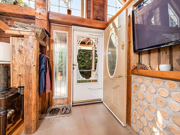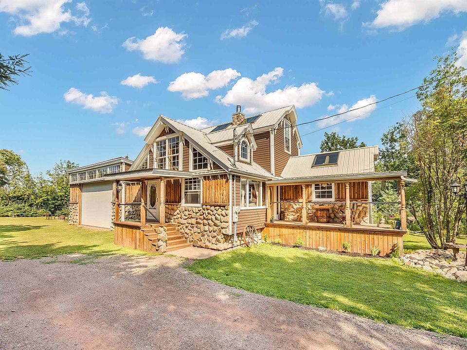 Rustic charm meets modern comfort in this unique, turn-key home tucked privately among the trees. This custom two-bedroom retreat offers a warm, inviting atmosphere with vaulted ceilings, exposed beams, and architectural details that add character throughout. The open-concept living area features a wood stove as the main heat source, with a new heat pump providing added efficiency and summer cooling. A recent energy audit confirms the home's impressive efficiency, with five-layer insulated walls ensuring warmth and lower heating costs. The kitchen provides plenty of counter space for cooking and flows seamlessly into the living space. The main level also includes a cozy bedroom, 3/4 bathroom, and laundry room. Upstairs, the private primary suite is a true oasis, complete with ensuite and skylights that fill the space with natural light. A large garage fits up to three vehicles or two and a workshop. The backyard is ideal for avid gardeners, and just down the road, you can enjoy river access- perfect for summer dips. Located only 10 minutes from Cornwall and 20 from Charlottetown, this charming home is ideal for anyone seeking a quiet, distinctive lifestyle close to nature.