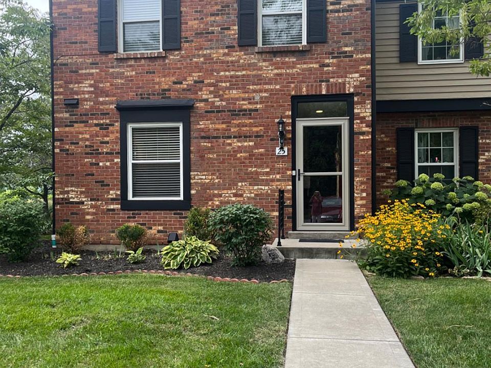 Best on the block! Carefree living in this stunning totally updated end unit townhouse. Ground floor entry, 3 bed (3rd is used for study). Custom from top to bottom, new doors, wrought iron stair spindles, lighting, carpet, paint, flooring, and custom blinds at patio walkout. Electric fireplace with color/temp controls. Private fenced paver patio walks out gate to pond with two breathtaking fountains. Full basement. Just minutes to 32, 275, and all the conveniences Eastgate has to offer!