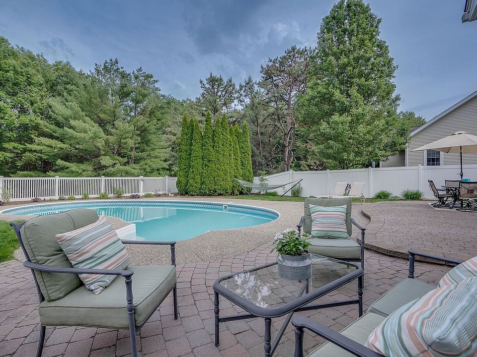 BIRCHSIDE COMMONS: BEDFORD's BEST KEPT SECRET! YEAR ROUND LOCATION & EASY LIVING for you to discover! UPDATED CONTEMPORARY with a fabulous forever floorplan- FIRST FLOOR PRIMARY and BEDROOMS UPSTAIRS...ideal,plus INGROUND POOL. Family and friends enter via the serene "Sit a While" farmer’s porch into the foyer living room which features a stacked-stone gas fireplace and is open to the spacious dining room. Oversized windows, high ceilings and hardwood flooring throughout the living areas. Fabulous center island chef’s kitchen that has an enviable walk-in pantry and abundant storage. The kitchen GATHERING ROOM is inviting w/newer cabinetry, granite surfaces, a center island and breakfast area (or barista morning area). DIRECT ACCESS to the pool area. The primary bedroom on 1st level the has TWO CUSTOM CLOSETS and terrific updated bathroom with soaking tub and tiled shower. MEGA VERSATILE FLOORPLAN: Overlooking the common center garden area for BIRCHSIDE there is a first floor home office. The 2nd floor has two bedrooms, a full updated bath, plus a bonus room with a huge walk-in closet. The lower level has been partially finished with ginormous family media area and music room, plus a gym area. TONS of STORAGE area too. LOCATION: Public water & natural gas. Located at the end of the cul-de-sac and beautifully landscaped, in super-convenient location close to highways, shopping, medical facilities and TOP BEDFORD SCHOOLS. SHOWINGS START SUNDAY 6.18.2023. OPEN HOUSE Sunday 12-2pm