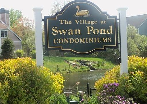 Another great unit in The Village at Swan Pond -- huge cathedral ceiling master bedroom with 2 double closets - full bath - a light and bright second bedroom - first floor - updated cherry cabinet kitchen with stone counters - electric cooking - dishwasher, disposal, generous dining area - living room with fireplace and large window seat - a place to sit and read and overlook private pond - access to patio for cook outs and just sitting! -gas heat and central air - there is a one car garage with opener- the complex offers 2 swimming pools - cabana, tennis courts and club house - convenient to the "T" and downtown - pet friendly community - you will love living here!