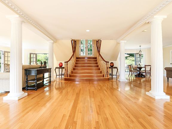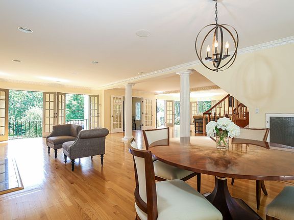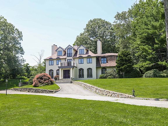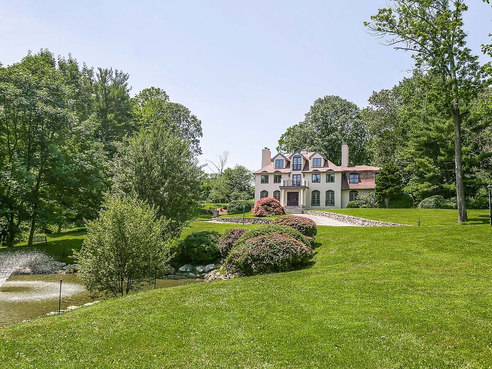 Majestic French Chateau privately set on gorgeous park-like property with a sweeping front lawn and a lovely natural fed pond with fountain. This five bedroom Colonial has an open layout, great light, four fireplaces, hardwood floors and beautifully integrates the interior and exterior spaces. The foyer welcomes you into the expansive living/dining room ideal for entertainment with 8 French doors that open to Juliet balconies and a stone patio. The spacious cooks kitchen has a oversized island, plenty of storage, and a door leading to patio. The upper level has the master suite with private balcony, fireplace, large bathroom and walk-in closet. There are three additional bedrooms that share two full bathrooms plus a fourth bedroom with ensuite bathroom. The third level features a bonus room with a great view, an office and full bathroom. The yard is private with beautiful plantings, a blue stone patio and an impressive swing set. Located close to town in a prime estate neighborhood.