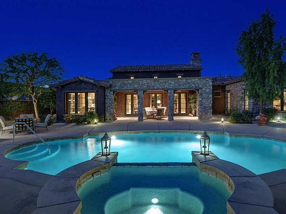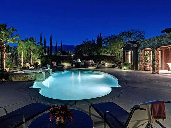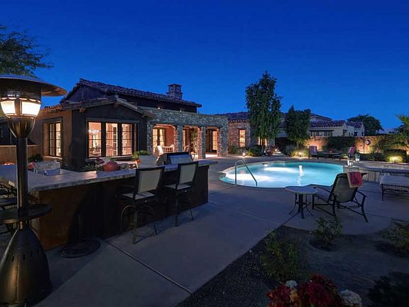 Dramatically detailed & luxuriously upgraded Tuscan Villa w/ panoramic Southern Mountain Views! Open floor plan offering multiple patios optimal for entertaining inside & out; Great room w/ 18' wood beamed ceilings, stately fireplace & wet bar. Numerous double French doors open to paver patio & inviting courtyard w/ wood burning fireplace. Gourmet kitchen to please the most discerning chefs - Rare Tunisian Granite counters w/ rich Maple cabinets, butler's pantry & top of the line Viking appliances w/ Formal dining room. Sophisticated style throughout this charming home w/ quality custom touches; Tumbled Travertine floors, wood shutters & custom coverings throughout. Master Suite w/ oversize walk-in closet, luxurious spa-style bath w/Onyx counters. Sizable entertainer's dream patio w/ Saline Pebble Tec Pool/Spa & BBQ island. Dramatic landscape lighting sets the tone for the cool & romantic Desert nights to come. Guests are accommodated w/ En-Suites including Casita. Offered furnished!