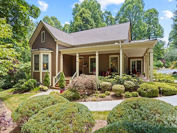 Simply Stunning! This exquisitely designed home graces nearly an acre of picturesque private setting and gorgeous landscaped grounds that are the most magical you will see. A gardeners paradise that exudes sophistication and luxury mountain living. The main level boasts 10' ceilings, Brazilian cherry wood floors, triple crown molding, 8' solid wood doors, great room with fireplace flanked by bookcases, kitchen with island and breakfast bar, high-end appliances, walk-in pantry and breakfast area, dining room, primary suite with walk-in closet, double vanity, walk-in shower and jetted tub, laundry with sink and cabinetry, office nook and powder bath. The upper level features 2 bedrooms/ 2 baths, study and sitting area. Outdoor living options abound with patios, wrap-around porch, back deck and pathways meandering throughout the gardens- all while listening to the waterfall. Amazing landscape lighting. Roof 2022, Generator 2024, Newer HVAC. The ultimate in relaxed luxury mountain living!