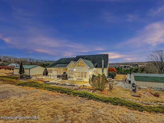 TRULY UNIQUE HOME AND PROPERTY. A sprawling hilltop ranch on 9+ acres offers amazing panoramic views as well as plenty of room for outdoor activities, gardening or even potential for farming or equestrian pursuits. The open floor plan features spacious living areas with large windows to let in all the natural light as well as enjoying the surrounding nature. This 4 bedroom, 3 and 2 half baths home offers so many possibilities for enjoyable country lifestyle living. Master bedroom has His & Hers walk in closets with an additional room for nursery, exercise room or office. The 4th bedroom above the attached garage includes a 3/4 bath and access to walk in attic for storage . This was previously used as a theater room/gaming room boasting an outstanding view of the mountainside. This is also wired for surround sound. If you enjoy entertaining, the 1600sqft fully finished basement is a fabulous addition to this home, including a half bath and bar, plus plenty of space for billiards, ping pong, darts or whatever you heart desires. The heated sunroom is such a cozy addition, perfect for enjoying the scenery year round.The patio out back has a fireplace to relax in the great outdoors. All tile floors on the first floor and lower level have radiant heat.. Whole house includes a distributed audio system. Central Vac. Wired for a generator. The 40X30' pole barn adds versatility whether it's for storage, a workshop, or even a barn for animals. Equipped with power, cable & phone lines.Enjoy hunting-DCNR owns 400+acres behind the home. All measurements and acreage is approximate and not warranted or guaranteed. Return check fee $40.