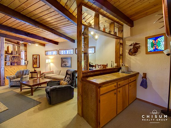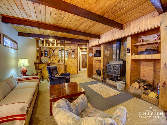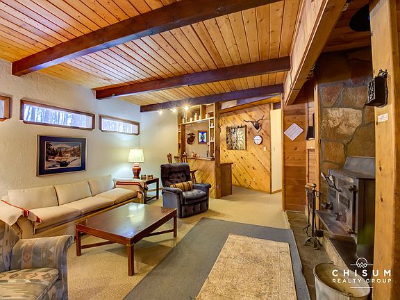 Tucked back from the road, surrounded by perfectly trimmed trees is a home that's ready for your family's retreat to the mountains. It is situated on a mostly level lot that also backs up to a green belt where wildlife is abundant and often comes by to say hello! The back of the home faces south which floods the home with natural light and on those cool winter days the sunroom is a perfect place to enjoy nature while staying cozy inside. The home features a living room with wood burning fireplace, wood beams, and tongue and groove wood ceilings. The first bedroom is on the main floor as well as the kitchen, dining area, laundry area, and sunroom. Leading upstairs is another sun filled area that opens to the sunroom below. Two more bedrooms are on each side of the second floor with an attached bath to the master bedroom. An additional bonus room is connected to the one-car garage which features vaulted ceilings and a separate heat source. Come and unwind in this affordable and furnished 3 bedroom home that's within walking distance to Monte Verde Lake.