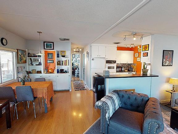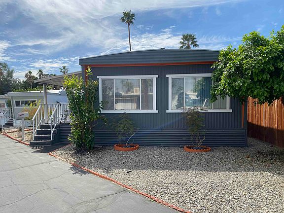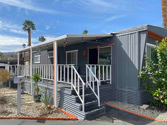 **Motivated Seller** for this move in condition double wide home is located in popular Tramview Mobile Home Community - the 55 year old and over well situated park. This 2 Bedroom 1 Bath home feels more like a single family home. It has a large Living/Dining/Kitchen with nice open view to the full length terrace with lovely east facing light. The primary bedroom even offers a desk alcove. The second bedroom features the in-unit washer and dryer. The hall bath is nicely proportioned. The Cook's kitchen includes a Breakfast Bar and new refrigerator and gas cook top. To the south of the terrace is a patio & covered parking at least two vehicles side by side. Two storage sheds are also included. Tramview features a large heated pool and spa, clubhouse with two kitchens, banquet hall with stage, card tables for cards and jigsaw puzzles and there are nine shuffle board lanes. Tramview is a short distance to Palm Springs Int'l. Airport, downtown Palm Springs and the new Agua Calliente Casino. You will be a few blocks from Trader Joes, Target, Bart's Bar, The Roost, The Barrack's Bar plus great dining! The new space rent will be $795.00 per month and includes water, sewer and trash. The gas and electric is added to the monthly bill and is metered by Park based on usage. Checkout the attached Floor Plan as well. Easy to show! Welcome to your new home!