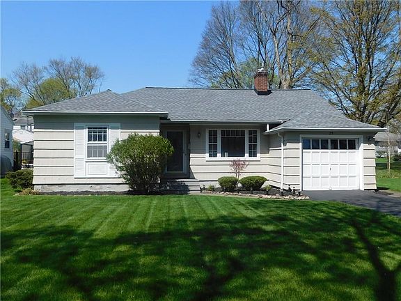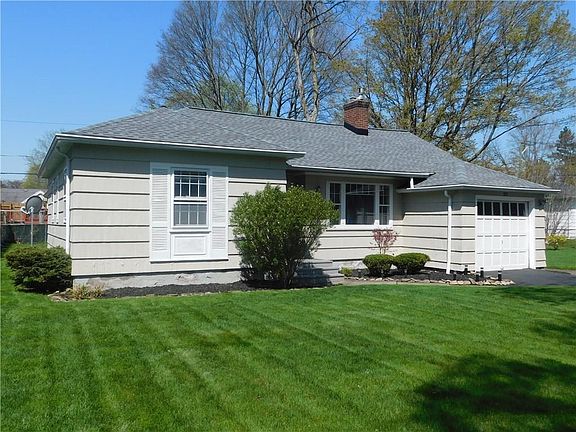 Terrific ranch with updates! Easy access to 12 Corners and 590 Expressway. 3 bdrms, 2 baths. New Tear Off Roof in 4/2017. New laminate flooring and interior painting 2010. Liv rm wgas frplc, built-in bookshelf alsoacts as door with stairs to access attic, 6 panel doors. Three season sun room with new carpeting in 2018. Appliances included, stove and refrigerator new in 2016. Finished recreation room in bsmnt , carpet 2010. Good mechanics, furnace, AC and water htr serviced 5/18. Nice backyard