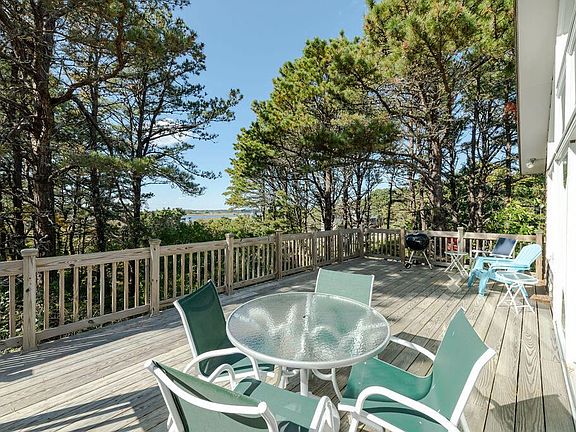 Indian Neck - your wait is over! This Contemporary home is worth the wait! Water peeks of Chipman's Cove from spacious deck and living room. Highly desirable area with pristine bayside swimming beaches a short distance away. Enter to foyer with a wall of glass to 2nd floor roofline creating a striking light filled entryway. Stairs up to 2nd floor living room with high ceiling & beams. Sliders with Palladian windows above create a sun-drenched living space; step out to spacious deck. Brick chimney with wood burning fireplace. Enjoy the open dining area and fully equipped kitchen + breakfast bar; plenty of pantry & cabinet space. Hallway leads to office on left w half bath. Main bedroom w high ceilings and custom windows, ensuite bathroom with shower. Sliding glass door opens to screened-in porch. Ground floor offers two spacious bedrooms, full bathroom plus laundry room with storage. Entry provides coat closet and door leading into two car garage. Steps to full unfinished basement w bulkhead access (storage galore). Wellfleet center is less than a mile. Conservation hiking trails throughout the area. Enjoys strong rental income if required. Truly a gem!
