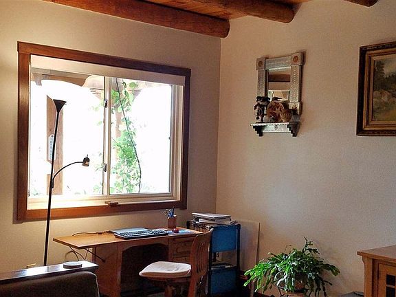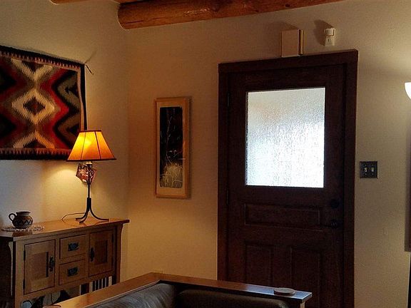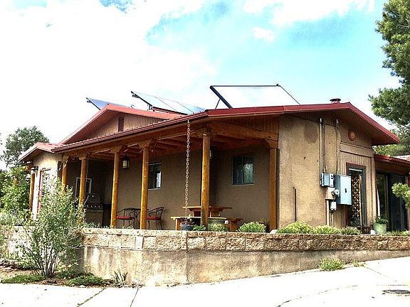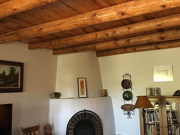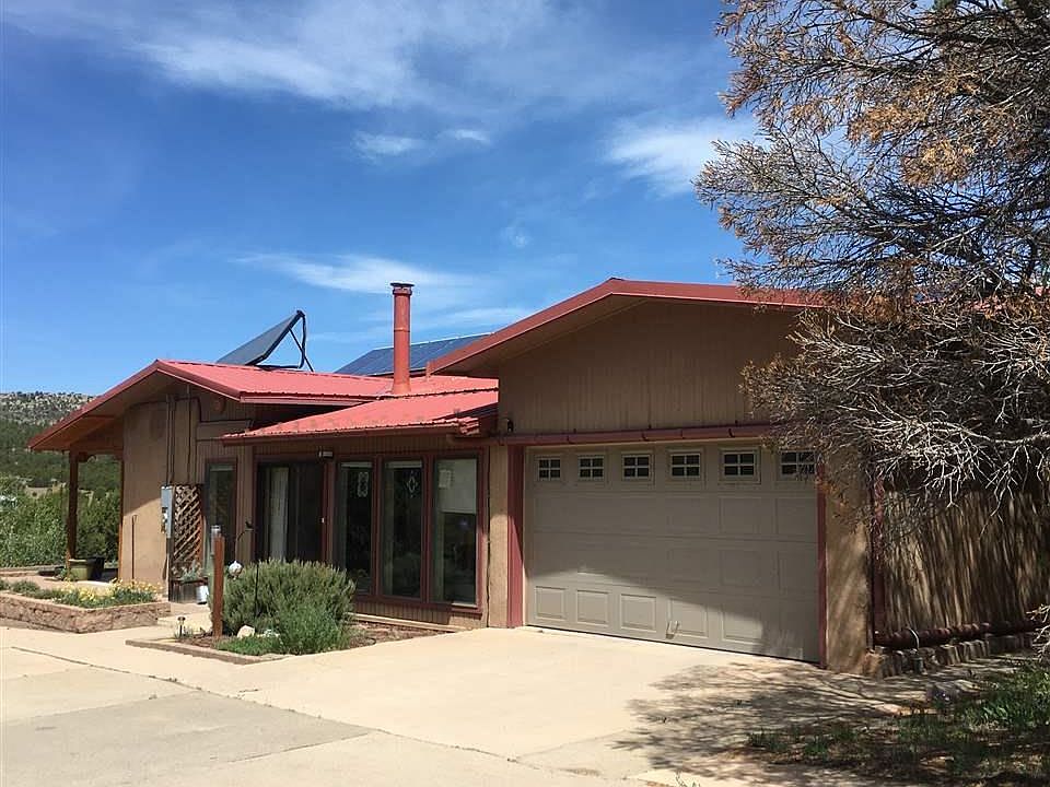 Tucked away on 5 ac. in the Ojitos Frios Sub. is this 3 bedroom/2 bath gem. Full of charm with beautiful Viga ceilings, wood floors, sun room and attached 1 car garage. Outside enjoy the covered portal with a view of Hermits Peak! There is a 2 car carport, beautiful landscaping, 3 large storage sheds, over 7500 gallons of water catchment tanks and a tranquil water feature. And at the end of your day, relax in the hot tub under the stars.