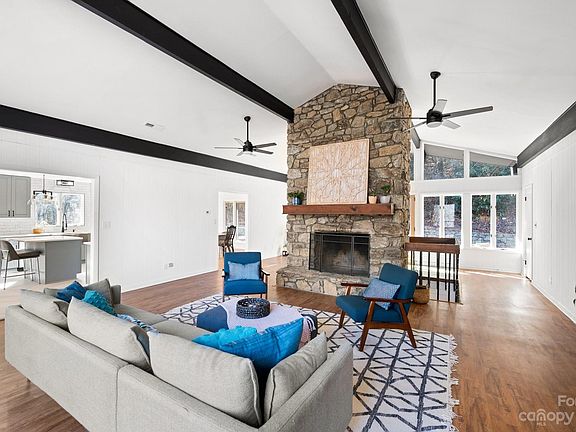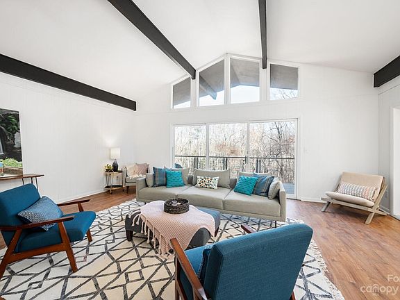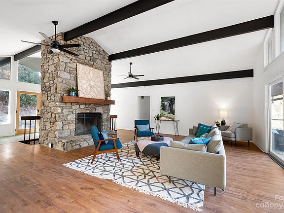 Rare mid-century modern deck home, tastefully renovated, in popular South Asheville. Convenient to Biltmore Park and South Asheville shopping and dining, this stunning home boasts significant updates while retaining its original charm and period details. Renovations include a new metal roof, new HVAC system, new modern kitchen, updated bathrooms, fresh interior paint, new deck railings, new garage doors, updated lighting and plumbing fixtures, and an expansion of the finished basement. This spacious home has five bedrooms + bonus room, three bathrooms, a main-level primary suite, a bright, open plan, and an oversized two-car garage. Living room features a vaulted ceiling with exposed beams and a soaring stone fireplace. Ample deck space for entertaining from living and dining rooms. Enjoy county taxes and city services — and the ability to use it as a whole-house vacation rental. Potential for a new neighborhood with amenities surrounding the home. See brochure for more details.