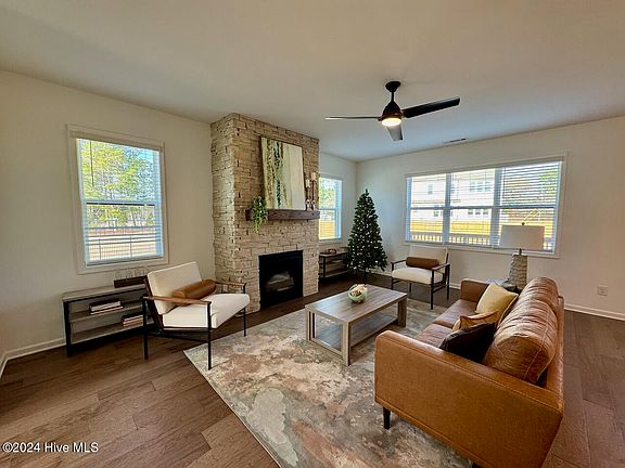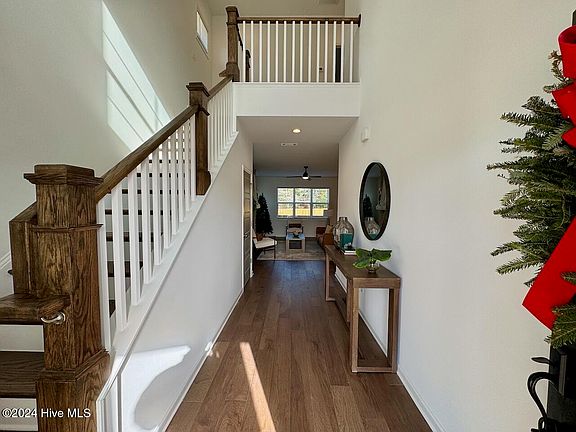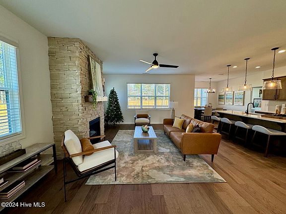 REFRIGERATOR AND WINDOW BLINDS INCLUDED PLUS A PRIVACY FENCE ALONG THE ENTIRE BACK PROPERTY LINE! | The Hayes A floor plan is a stunning 2,576-square-foot home nestled on a generous 0.596-acre lot. This home boasts 4 spacious bedrooms and 2.5 bathrooms, including a luxurious first-floor owner's suite with a 6x6 brick-pattern walk-in shower featuring sleek white gloss tiles. The home is built on a crawlspace, and the exterior showcases a covered front porch, high-quality fiber cement siding accented by Morning Smoke brick, custom-stained shutters, and an oversized sideload garage. Step inside to find gorgeous Piedmont Hickory engineered hardwood floors leading you to the family room with a custom-built fireplace, adorned with Dutch Quality Arizona Dry Stack stone stretching to the ceiling and a matching solid wood beam mantle. The offers soft-close cabinetry, a large island topped with Level 4 Silestone Desert Silver quartz countertops, matte black hardware and fixtures, a 3x6 Dorian matte brick-pattern tile backsplash, a walk-in pantry with built-in shelving, and stainless-steel Whirlpool appliances. Convenience meets style on the first floor with a dedicated laundry room and a mudroom featuring a custom bench with cubbies and painted shaker back panels. Upstairs, you'll find three additional bedrooms with walk-in closets, a full bathroom with a double vanity and Masso tile flooring, abundant storage, and a spacious recreation room offering endless possibilities for your lifestyle needs. Loaded with premium upgrades and thoughtful features, this home has it all. Visit us today and discover why now is the perfect time to make Griffon Pointe your home!