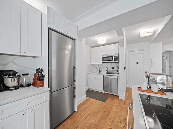 Bosch microwave and refrigeratorWhite lacquer cabinetryBlock from central parkElegant residential buildingsClean polished silver hardwareHigh-end vanities and fixturesRestoration hardware light fixtures