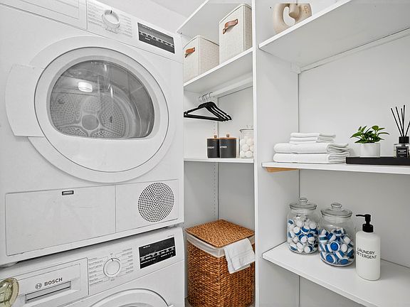 The bedrooms include large closets, as well as enough space to include small sitting areas or home office setups in addition to large beds. Each includes an ensuite bathroom finished with black and white hand-laid tile, high-end vanities and fixtures, and clean polished silver hardware. The home also includes a full-sized stacked washer and drier.