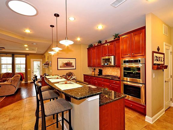 Simply put ''Comfortably Spacious'' Hawthorne model on the east side, walking distance to the clubhouse. Professionally landscaped, covered front porch, perfect for watching the sunset, you can also retreat to the backyard covered screened in porch with lights/ceiling fan that leads out to a paver stone patio. The entrance boast arched walls, hardwood floors through out the main living areas, the kitchen is a chef's delight with SS appliances including two separate convection ovens, 4 stool breakfast bar with upgraded 42' cherrywood cabinets and granite countertops, finished off with tiled backsplash. The library has double french paned window doors, the dining room has a tray ceiling with wainscoat trim. M/bedroom with a walk in closet and a m/bathroom with a seated seamless glass shower.