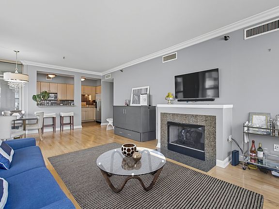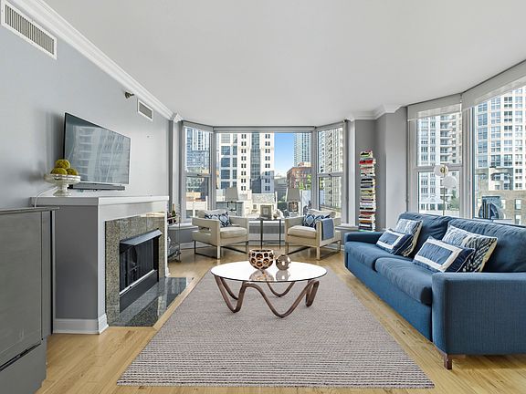 Rarely available corner 1-bedroom, 1.5-bathroom corner condo in the prestigious Fordham building offers a perfect blend of elegance, functionality, and vibrant city living. With floor-to-ceiling windows and northeast city views, the space is drenched in natural light. The open-concept layout features refinished hardwood floors throughout, a gas fireplace, and a flexible living and dining space perfect for entertaining. The kitchen includes granite countertops, stainless steel appliances, and ample cabinet storage. Retreat to the primary suite, featuring a walk-in closet and a spa-like en-suite bath complete with a soaking tub, separate walk-in shower redone with Italian tile, and dual vanity. Have a morning coffee on the private, covered balcony surrounded by lush planters and city views. The Fordham offers resort-style amenities, including an indoor pool, renovated fitness center, sundeck, theater, party room, dog run, and more - all supported by 24-hour door staff and on-site management. Located just steps from Whole Foods, Eataly, Gibsons Steakhouse, RPM Seafood, Hubbard Street nightlife, luxury shopping on Michigan Avenue, and the CTA Red Line, this home puts the best of Downtown Chicago at your doorstep. 1 garage parking space - additional $35,000.