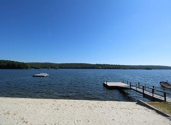 Knollcrest - Sought after Candlewood Lake community. A short stroll to your own private sandy beach with idyllic water views. Entertain in this spacious home with open floor plan, hardwood floors, living room with soaring ceiling and dramatic floor to ceiling raised hearth stone fireplace and view of Candlewood Lake. Dining room leading to deck. Designer updated master bath with whirlpool and shower. Tiled lower level family room with full bath, laundry room, bar and floor to ceiling brick fireplace. Only 70 minutes to New York City.