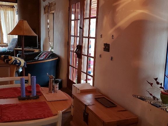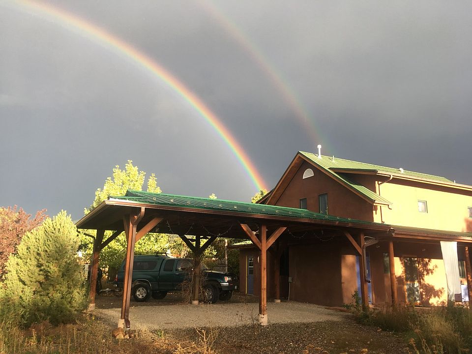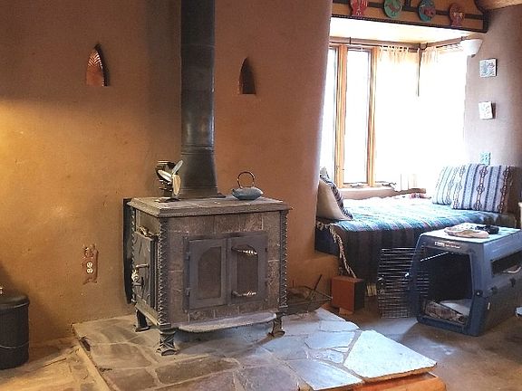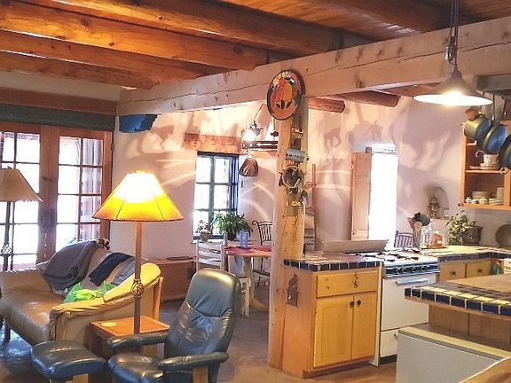 Artfully designed territorial style home 2 beds, 2 bath, office and sun room built with attention to environmentally sensitivities. The home features both rural and mountain views. Water catch system is directed to a drip system to water extensive gardens and many types of fruit trees, herbs and berries. Plus irrigation from local ditch. This property also includes a 2 bed 2 bath guest house with separate office entry. Rental income. Stables and corals and out buildings make a great horse property. Natl forest is approx a mile away for your riding pleasure. 10 min drive takes you to the heart of Taos. Well insulate many extras you must see to appreciate