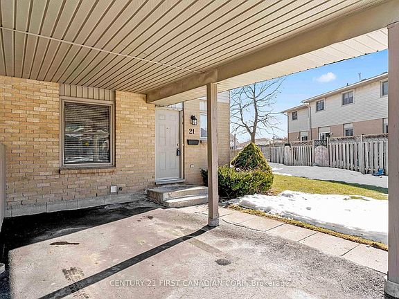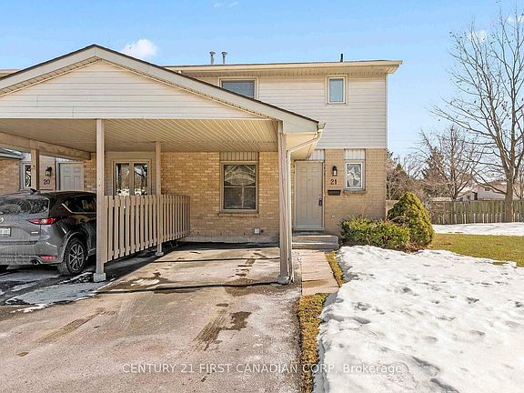 Dont miss this beautifully renovated end-unit townhouse featuring 3 bedrooms, 1.5 bathrooms, a finished basement with a bright rec room, and plenty of storage. The main floor boasts a modern kitchen with brand-new white cabinetry, sleek granite countertops, an elegant backsplash, and stylish ceramic flooring. A separate dining room with a contemporary light fixture flows into the spacious living room, where sliding doors open to a private, fenced patio. A newly updated powder room completes the main level. Upstairs, the oversized primary bedroom offers two large closets, accompanied by two additional generously sized bedrooms and a renovated full bathroom. The finished basement provides a versatile rec room, a laundry area, and abundant storage. Perfect for first-time buyers and investors alike, this home is ideally situated near White Oaks Mall, the library, recreation center, parks, grocery stores, schools, and just minutes from Highway 401.