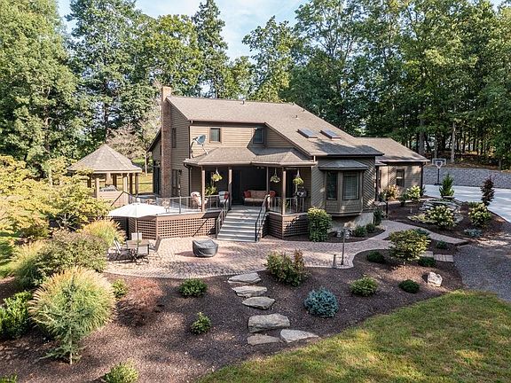 Welcome to this exquisite and secluded masterpiece on nearly four wooded acres in the Wilson School district. Surrounded by nature in a highly-desired picturesque setting, this property offers stunning features from every angle. First impressions are wildly enticing with the beautiful tree-lined entrance, spacious parking pad for additional vehicles and recreational fun, professional landscaped exterior, freshly stained siding, and nearly 1,600 square feet of decking and hardscape for entertaining or relaxing; the interior is beautifully appointed with an inviting entrance foyer leading to the spacious kitchen with white cabinetry, vaulted dining and living rooms, main level laundry, flexible bedroom layout/design, and a basement that's fully equipped with a full bar and large family room. The newly renovated detached garage has heated flooring, tall ceilings, and electrical hookups for all your hobbies! UNIQUE. BREATHTAKING. GORGEOUS. What more could you want?