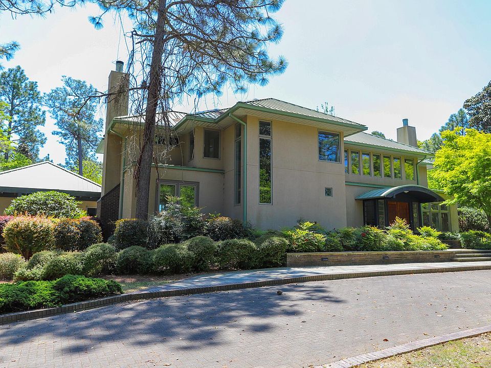 Location! Location! Location! First time offered! This glorious Mid-Century Modern custom home, designed by Hayes/Howell Architects, sits on two and a half acres of beautifully landscaped property on the 11th hole of Pinehurst No. 7. The original owners purchased the property six years prior to building their home and spent that time working with landscape architects to create a stunning and very private setting complete with flowering trees, shrubs and winding scenic paths through the property. The home features a two-story entry with a spacious living room to the right with a window wall along the entire end that overlooks the yard. A wide hall off the foyer leads to the left to a smaller family room with a fireplace that also overlooks the back yard. The architects designed the