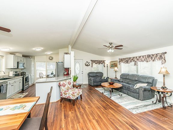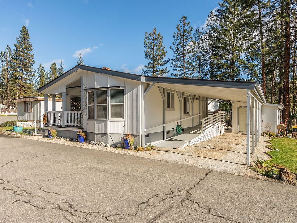 Enjoy the conveniences of living in the park and being so close to all amenities, the park maintains the roads, sewer and water, all included in the space rent of $375 per month. This unit has the most charming back yard with a babbling brook as well to sit by and enjoy. Inside the completely remodeled home you will be delighted to the new counter tops, new flooring, new tile surround shower, new vanity and so much more and all so tastefully done, also great natural light through out the home. An attached 2 car carport and with a ramp for easy access into the home, a detached storage shed/ work room with power, and a fenced in garden area. This is keeper!!! Don't miss out on it !