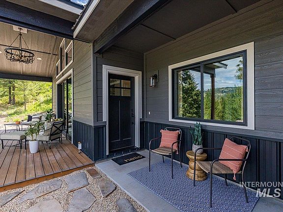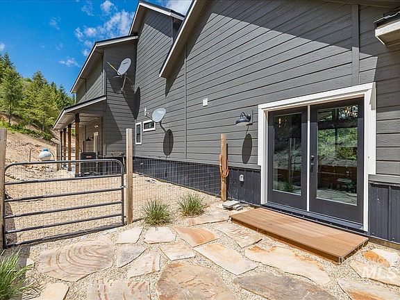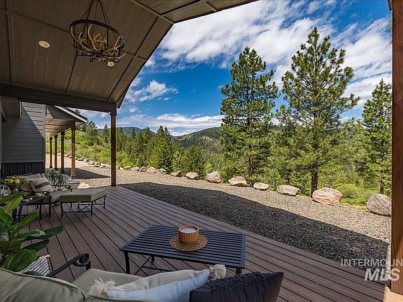 Nestled in the forest above Daggett Creek with an unobstructed view, you'll find this beautiful, private, secluded custom home with modern upscale amenities on 5.5 acres. The wall of windows allow you to take in the breathtaking scenery for miles. Main level living area has a gorgeous gourmet kitchen, spacious great room that includes a floor to ceiling stone fireplace. Under stairs dog house. Luxurious primary suite w/ private deck,2 closets, spa bathroom, large walk in shower and jetted tub. Second bed and bath also on main level. Upstairs huge bonus room, full bath, guest room and loft office. Enjoy the outdoor patios listening to the pond waterfall and enjoying the wildlife that roam frequently. Large 4+ car garage w/ RV Bay. 22x30 shop, 10x20 barn storage shed with power. XL fully fenced dog run and dog shower included. Terraced garden area. Wilderness Ranch Subdivision maintains the roads year round. WR sub is a stress-free 30 minute commute from Boise. Own your piece of tranquil, private Idaho.
