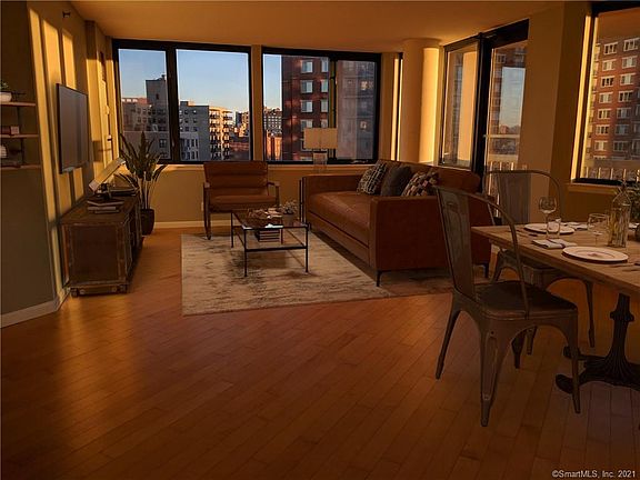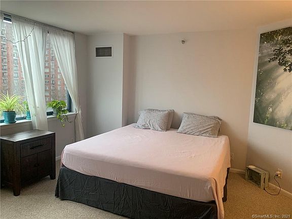 Stylish, mid-city Stamford condo in luxury 24/7 concierge-building with rooftop indoor heated pool, fitness center, dog park, gas grills and picnic tables all just steps away from Bedford Street restaurants. The condo features a large open plan living/dining room with plenty of space for a work-from-home station and a large dual aspect balcony where you can enjoy views of Long Island Sound and the Stamford skyline. This larger 1 bedroom unit features a master suite with full bath, 3 separate storage closets and plenty of light. There is a second full bathroom for guests. The kitchen features stainless steel appliances, granite countertops, gas stove and breakfast bar which opens to the living/dining room. There is a washer/dryer in the unit and an assigned parking space in the attached covered garage, along with bicycle storage space. Every convenience is available at "The Classic" - a prestigious building on tree-lined Forest Street.
