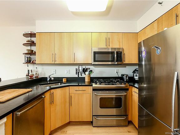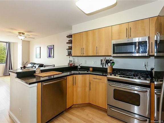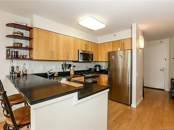 Bright one bedroom, one bath north-facing unit in this full-service, pet-friendly building with its own dog park in the heart of Stamford. Unit has well maintained conversion fit-out, which has granite counter-tops, stainless steel appliances, wood flooring. Upgrades include bamboo flooring in master bedroom, closet system in walk-in, additional shelving in kitchen and laundry room, and new heat pump. Garage space is large:)! Contact Juan Sosa at 203.969.4672 for private showing or questions.